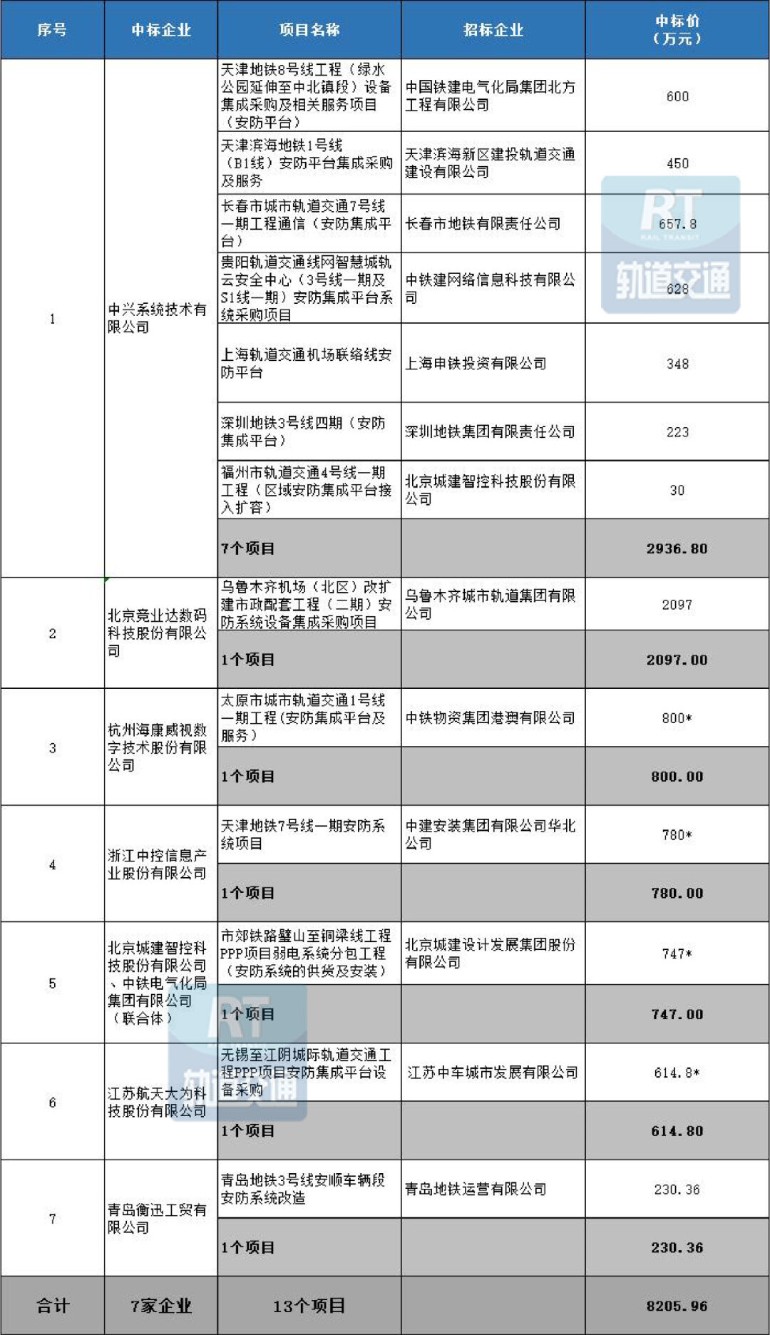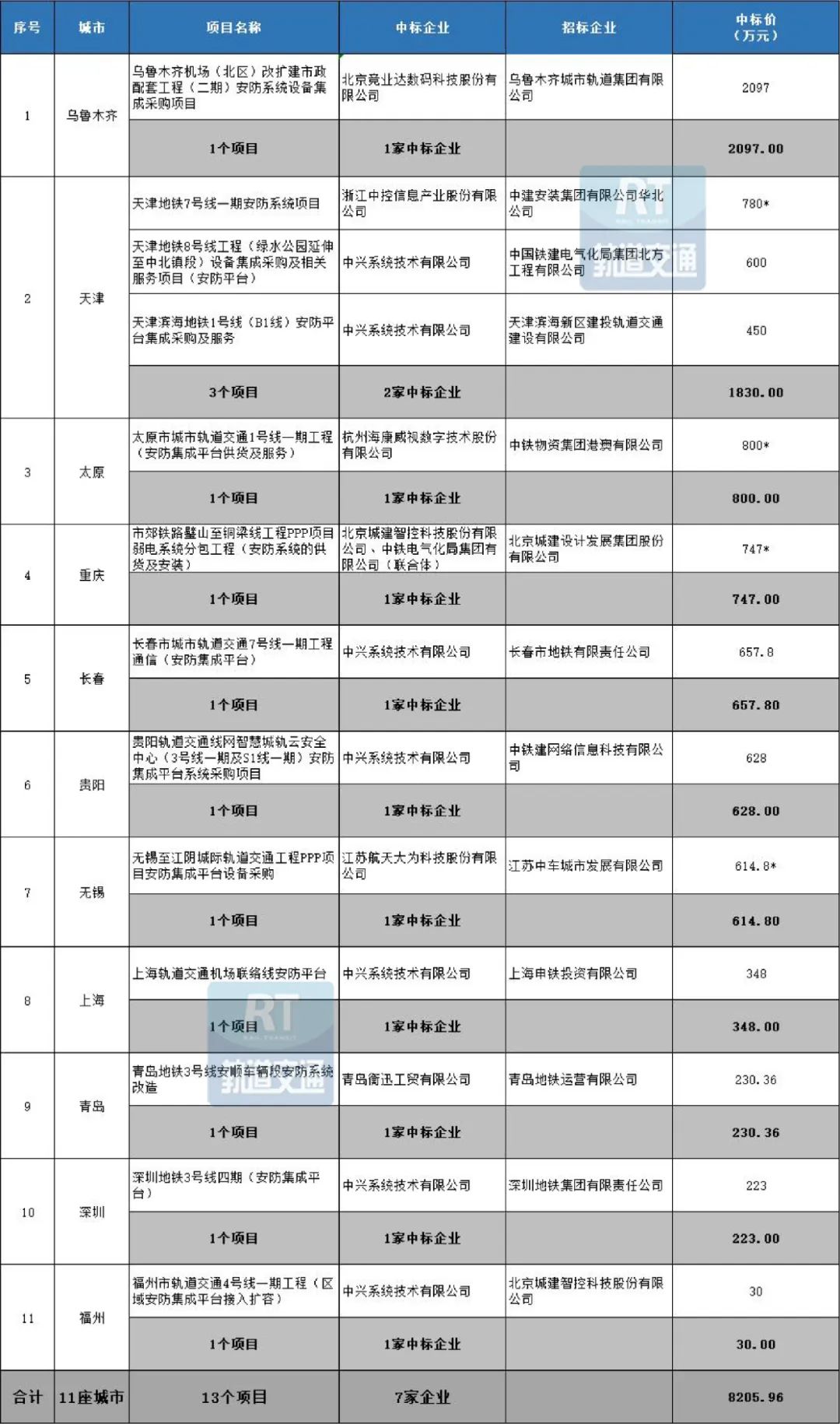 据RT轨道交通统计显示,2023年城市轨道交通共有11座城市的业主发布了13个安防中标项目,总中标金额超过8205.96万元,共涉及中标企业7家;2023年城市轨道交通共有19座城市的业主发布了31个安检中标项目,总中标金额超过35468.18万元,共涉及中标企业13家。