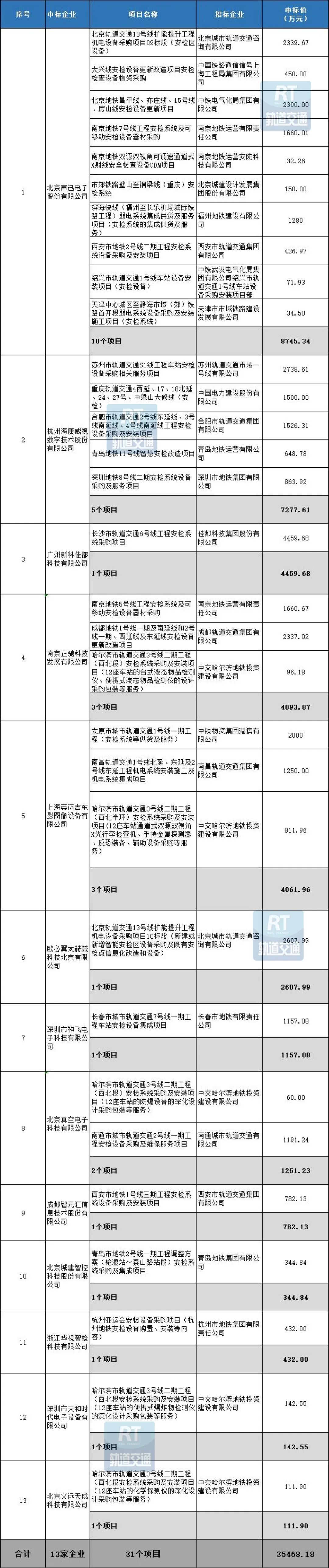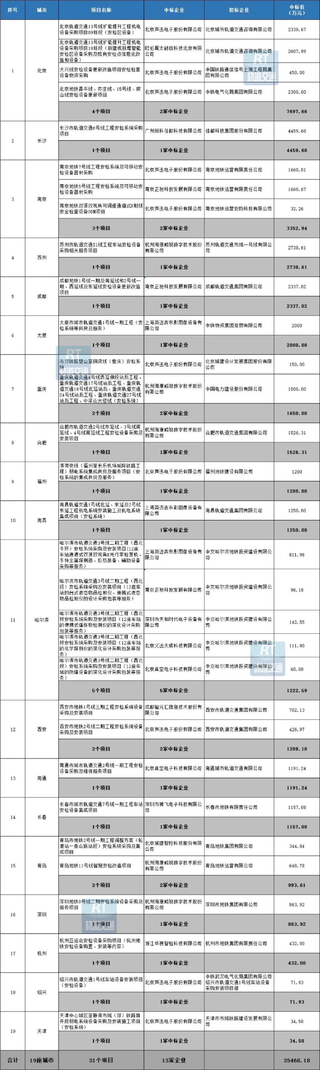 据RT轨道交通统计,2023年,共有19座城市公布了城市轨道交通安检系统的中标信息,涉及项目31个,共计中标金额达到35468.18万元。