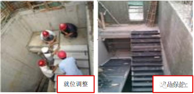 预制楼梯连接处,水平缝采用 C30 细石混凝土找平。预制楼梯吊装采用厂家设计的吊装件,使用 2.5 吨的鸭嘴型吊具吊装。在上层墙体出模后,吊装下层预制楼梯踏步板,保证 L 型梁强度。为便于安装,预制楼梯起吊时,角度略大于梯板自然倾斜角度吊装(如:自然倾斜角度 33°,起吊时倾斜角度为 34°~36°)。用厂家提供的吊装分配梁及附属吊具进行吊装;楼梯采用长短绳调运,确 保吊装时的状态与安装后的状态相同,楼梯梁采取平吊。吊装完成后,进行校正;预制楼梯连接处,立缝采用 C30 细石混凝土填实;楼梯与休息平台上端连接采用钢板焊接。楼梯为施工过程中的主要垂直通道,在连接固定完成后必须在表面铺设模 板进行成品保护。参考图片
