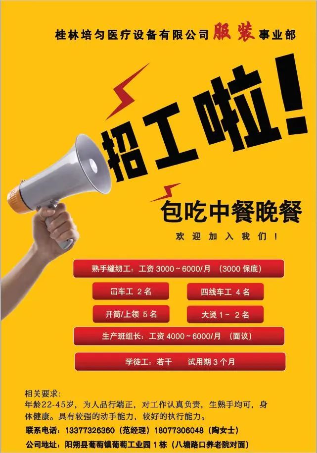 【招聘信息】桂林培匀医疗设备有限公司服装事业部招工啦!