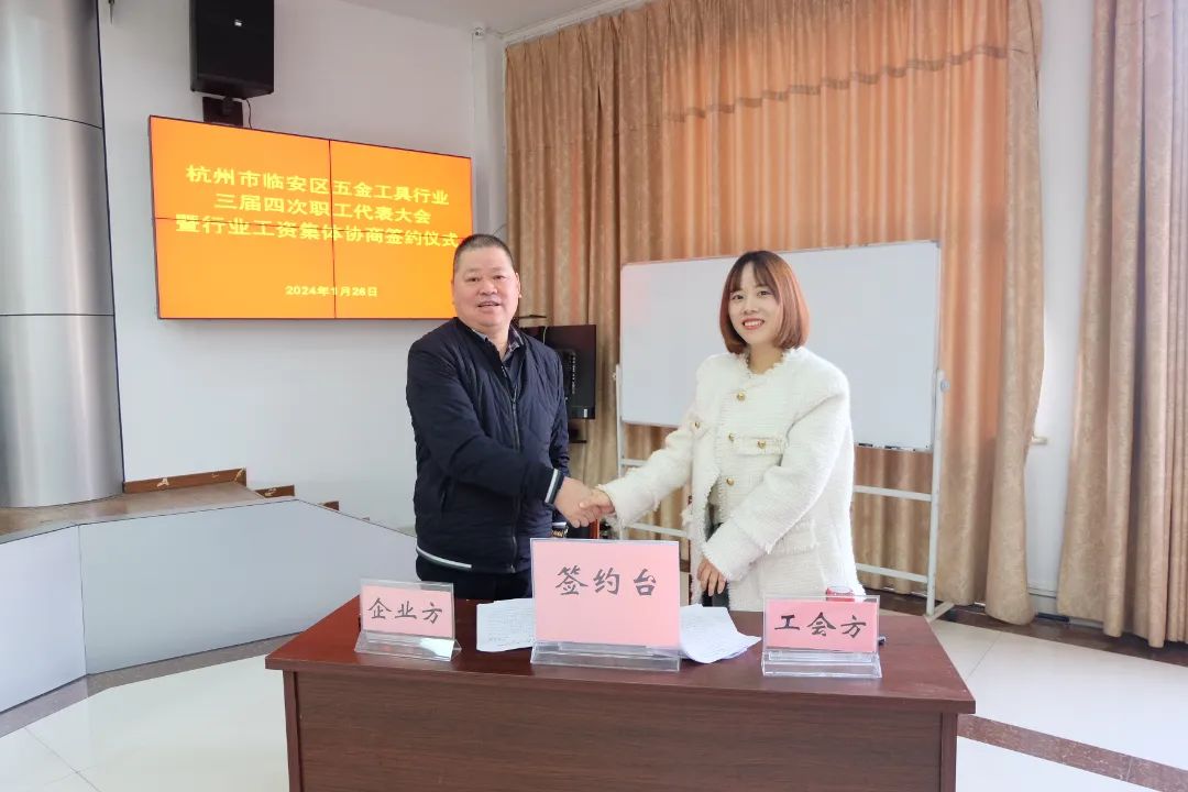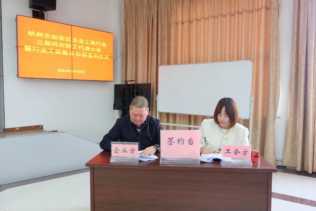 ▲《临安区五金工具行业职工工资专项集体合同(2024年度)》签字仪式。