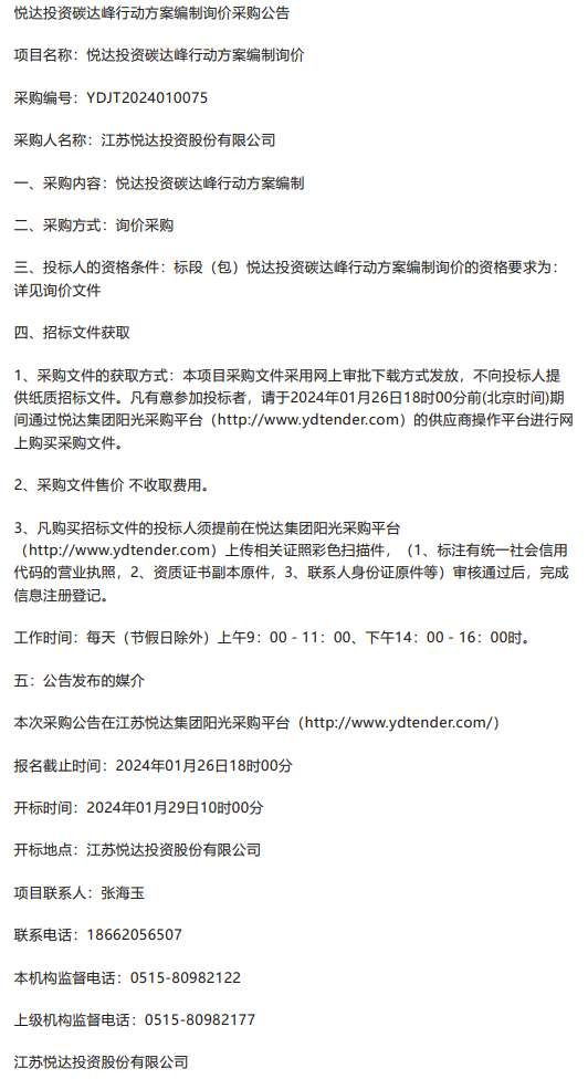 6.【招标】碳方案-悦达投资碳达峰行动方案编制询价公告