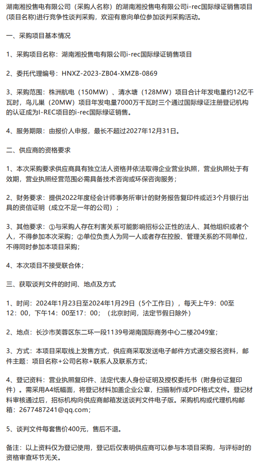 5.【招标】国际绿证-湖南湘投售电有限公司i-rec国际绿证销售项目谈判邀请