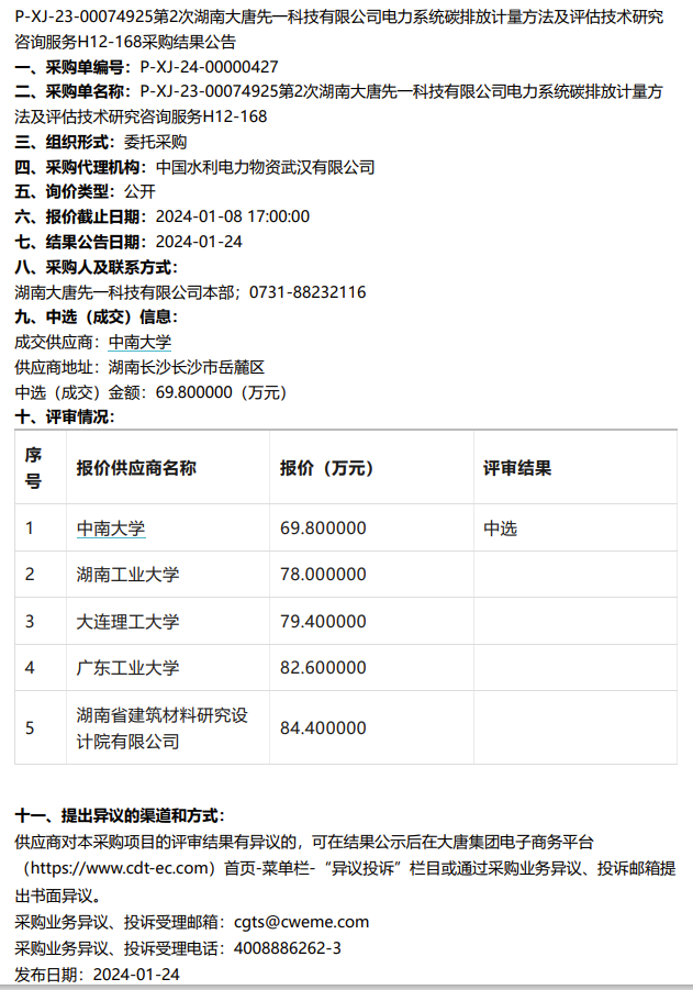 9.【中标】碳排放69.8万-湖南大唐先一科技有限公司电力系统碳排放计量方法及评估技术研究咨询服务H12-168采购结果公告-中南大学