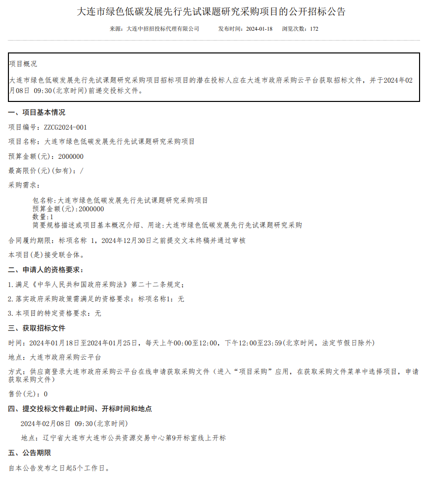 3.【招标】碳课题200万-大连市绿色低碳发展先行先试课题研究采购项目的公开招标公告