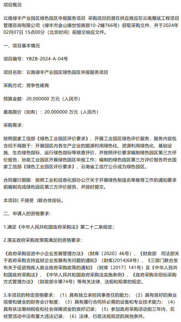 4.【招标】碳系统20万-云南禄丰产业园区管理委员会云南禄丰产业园区绿色园区申报服务项目竞争性磋商