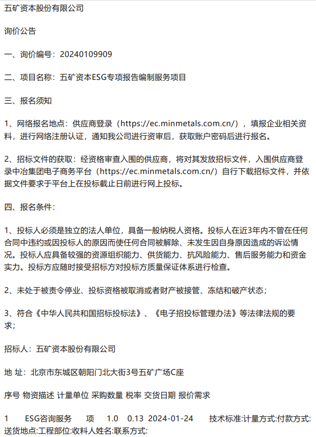 1.【招标】ESG咨询-五矿资本ESG专项报告编制服务项目询价书
