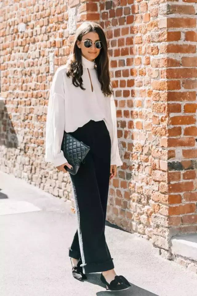 黑白色经典单品搭配在一起,确实简约又高级,但是不如用一件轻盈鲜艳的阔腿裤来提升整体的新颖时髦度。