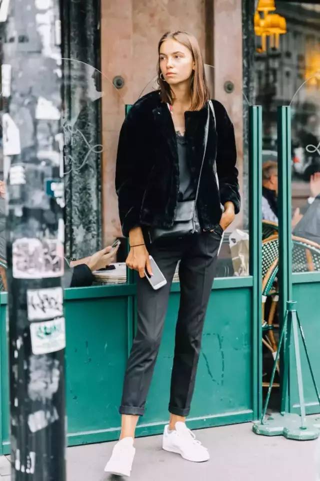 黑色单品搭配在一起,用一双白色运动鞋来增加整体的轻盈。