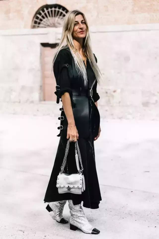 黑色长裙用一件皮质马甲来增加时髦感。