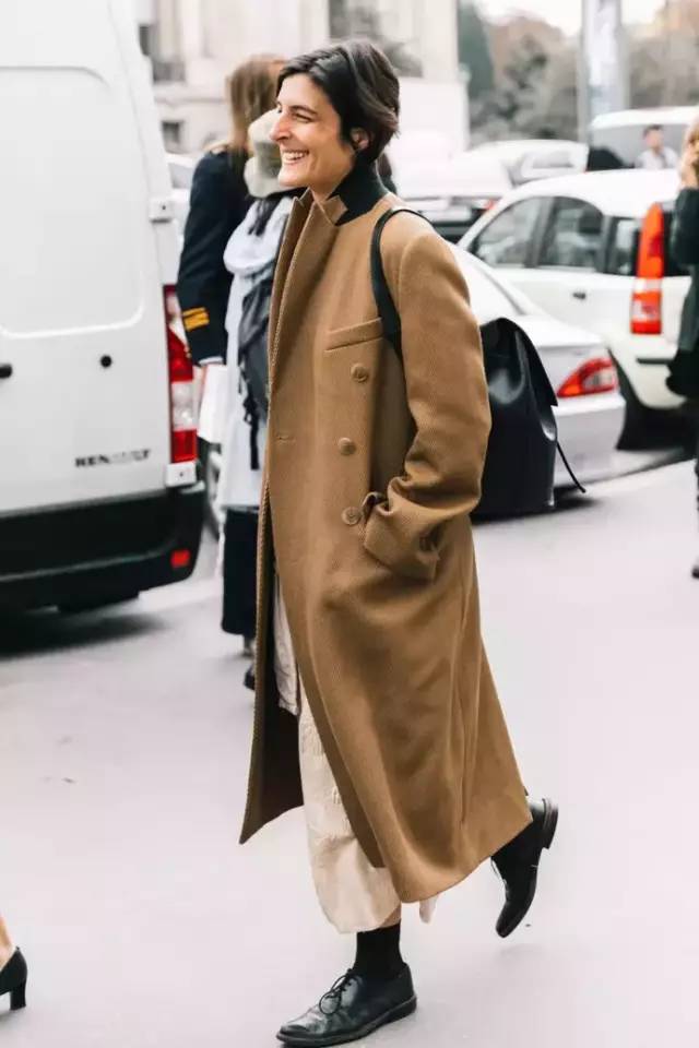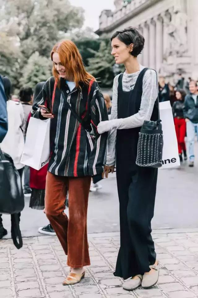 棕红色灯芯绒阔腿裤,搭配呼应上身的文艺衬衫,点缀一双别致的时髦鞋款,整体简单却很有内涵。