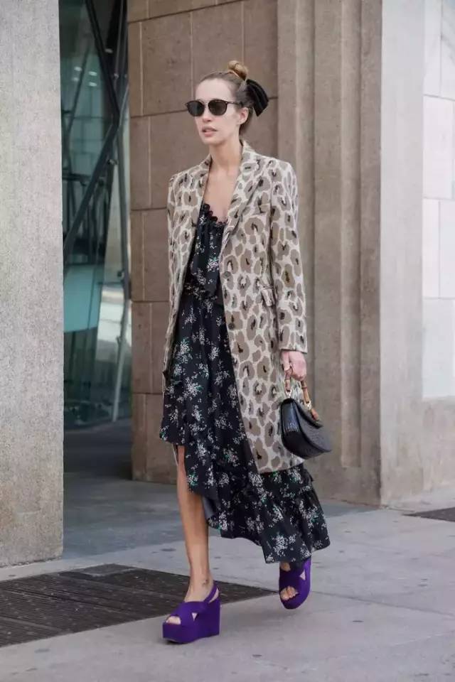 当两件印花单品叠穿在一起的时候,可以选择一明一暗,一深一浅的印花单品,青驼色的豹纹大衣,搭配黑色印花不规则长裙,深浅适宜,风情又时髦。