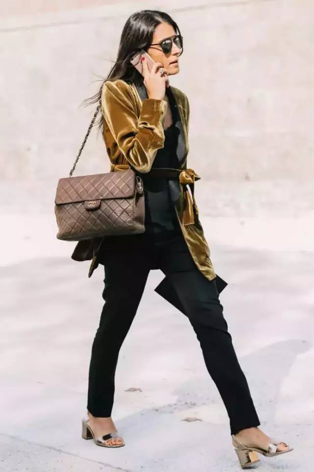 丝绒的高级感搭配黑色经典裤子。