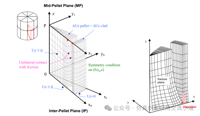 图1:ALCYONE三维方案中的网格和力学边界条件(左)。图片说明计算小球热沙漏与所谓的三重点的位置(右)。