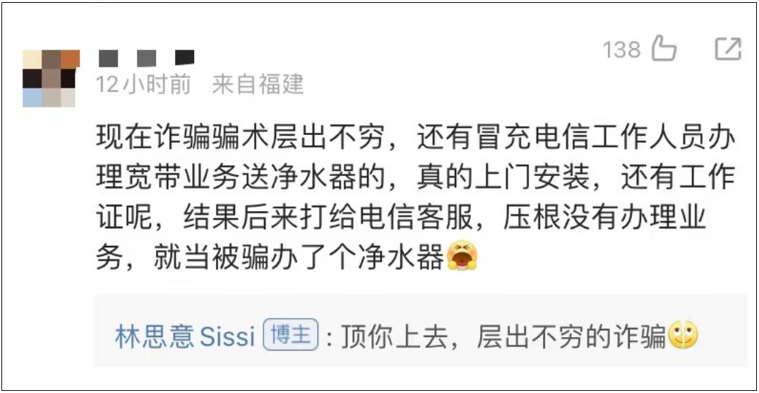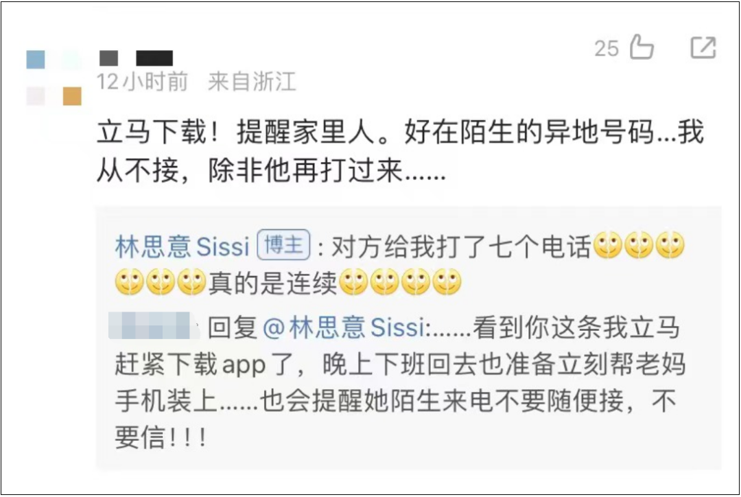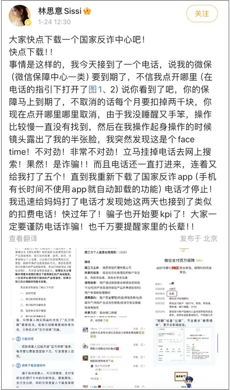 她还说,“快过年了!骗子也开始要KPI了!大家一定要谨防电话诈骗!也千万要提醒家里的长辈!”林思意也呼吁网友,“快点下载一个国家反诈中心(App)吧!”