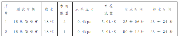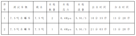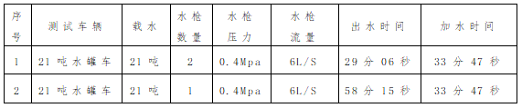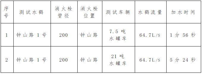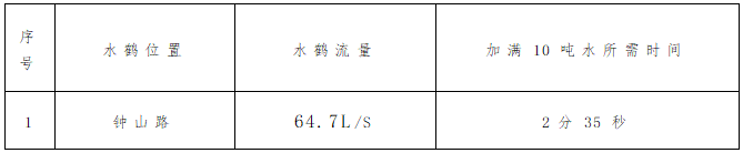 测试钟山路1号水鹤,为7.5吨水罐车加水时,水鹤流量64.7L/S,7.5吨水罐车加满水用时1分56秒,21吨水罐车加满水用时5分24秒。