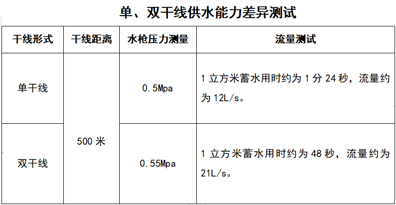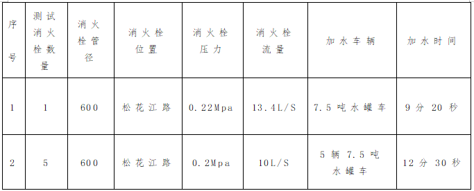 测试松花江路消火栓(管径600毫米65口径地下消火栓),1个消火栓为消防车加水时,7.5吨水罐车加满水用时9分20秒。同一管道相邻消火栓同时为消防车加水时,5辆7.5吨水罐车加满水平均用时12分30秒。经测试松花江路同一管道消火栓在保证正常供水的情况下,最大可以同时容纳5辆消防车加水。