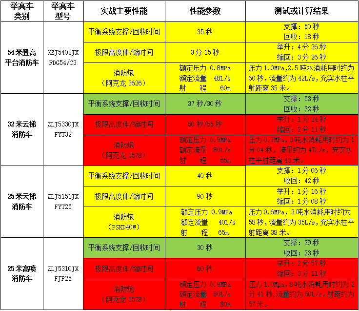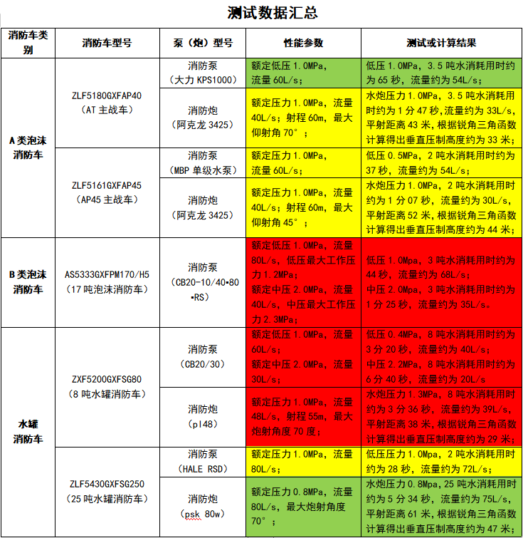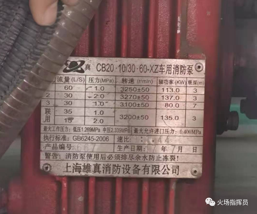车长7.5米,宽2.45米,载水3.5吨,载泡沫0.8吨,水泵流量50升/秒,车载水炮流量42升/秒,水炮最大射程70米,最大进水压力0.4MPa,水炮俯仰角-19度-53度,水平回转角度330度。