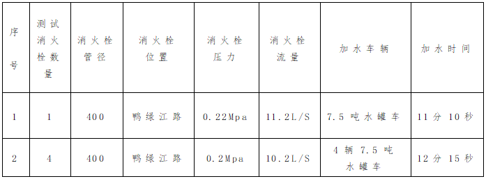 测试鸭绿江路消火栓(管径400毫米65口径地下消火栓),1个消火栓为消防车加水时,7.5吨水罐车加满水用时11分10秒。同一管道相邻消火栓同时为消防车加水时,4辆7.5吨水罐车加满水平均用时12分15秒。经测试鸭绿江路同一管道消火栓在保证正常供水的情况下,最大可以同时容纳4辆消防车加水。