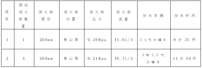 测试泰山路消火栓(管径200毫米65口径地下消火栓),1个消火栓为消防车加水时,消火栓流量14.6L/S,消火栓压力0.26Mpa,7.5吨水罐车加满水用时8分钟35秒。同一管道相邻5个消火栓同时为消防车加水时,消火栓流量10.7L/S,消火栓压力0.21Mpa,5辆7.5吨水罐车加满水平均用时11分40秒,经测试泰山路同一管道消火栓在保证正常供水的情况下,最大可以同时容纳5辆消防车加水。