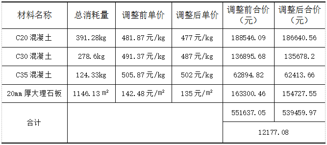接下来分析是否可以进行降低人工、材料、机械设备等费用。其中施工机具使用费仅仅只有21797.79元,只占分部分项工程费中很小一部分,因其对总报价没有实质影响,所以没有将降低其价格考虑在内。依据表4可知,人工费为773394.07元,占分部分项工程费的30.12%,可以表明人工费是费用组成中很重要的一部分。可以考虑调整其价格,根据之前已建的工程项目来看,该单位实力雄厚,且施工人员和组织人员经验丰富,可以使项目的人工效率提升约5%,这样计算下来,人工费降低了38669.7元。接下来就该考虑材料费的调整。该分部分项工程中材料费为1601130.98元,其占比高达62.36%,可以看出材料费在整个项目中占了非常大的比重。经了解,该单位与一些原料供应商长期保持了良好的协作关系,经过沟通和协调,供应商提出可以优惠部分材料的价钱。在这些材料的消耗中,可以发现C20、C30和C35混凝土、钢筋等材料的价钱占了很大的比例。在和市场价进行比对后,C20、C30和C35混凝土的单价分别是481.87元/m³、491.37元/m³、505.87元/m³,经过与供应商的协调,最后可以拿到这些材料的价格降为了477元/m³、487元/m³、502元/m³。从清单中可以知道钢筋在整个工程中的占比也是非常之大,但是在建筑市场中钢筋的价格一直处于不稳定的状态,所以不能随意调整钢筋的单价,以免往后在实际施工时,钢筋的价格波动为施工单位带来非常巨大的经济损失。还可以调整的材料有大理石板的单价,调整前的大理石板单价为142.48元/㎡,该单位可以拿到的供应价格为135元/㎡,其他材料的价格暂时不进行调整,最后得出总材料费可以降低12177.08元。调整后的材料单价见表7所示。