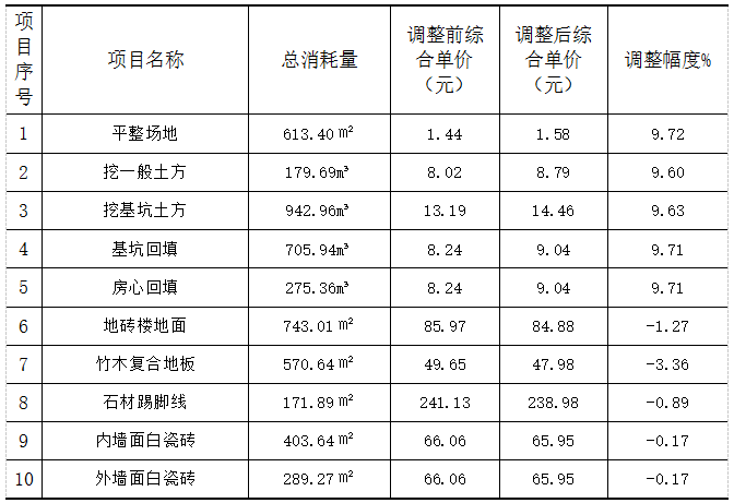 该报价法的主要目的是在不改变总报价和不波及该单位中标的条件下,对某些分项工程的综合单价进行调整,使其在最后达到较好的经济效益。应该认真地研究和分析该报价法,尤其是对报价中的单价比较低的,因为在具体施工过程中,工作量的增长会对承包商的经济效益造成很大的影响。另外,在运用此方法的情况下,务必要将变化的单价掌控在合理的范畴之内,以免招标人对此提出质疑,认为其不合理,最终甚至造成投标作废。因此,项目单价的变动幅度应该维持在百分之十以内,并且不能使整个总价变动太大。 前面已经对该工程的工程量进行认真地核对、分析,结果表明,得出的工程量与招标人提供的工程量是一致的。因此将一些分部分项工程项目做了适当的调整。该项目调整后的综合单价项目见表5所示。