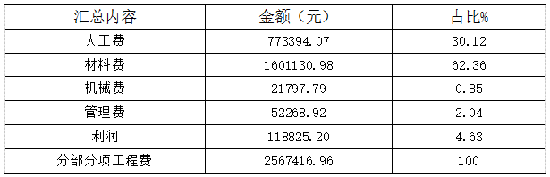 由表5可知,一共调整了10个项目的综合单价,但是调整后的总额只减少了1.79元,可以忽略不计。然后将各项目综合单价的调整范围控制在10%的范围内,使早期结算的挖土方和回填方的综合单价提高,后期结算的楼地面装饰和墙面装饰等项目的综合单价降低,从而取得较好的经济效益。 在进行程序化报价的同时,该投标单位结合自身业务水平和实际情况,对招标人适当的提出了附带的优惠条件: (1)承诺中标后,在工程竣工后定期对工程进行巡视、保修,并且做好记录,对由于该单位施工原因造成的意外损坏,将随时进行处理; (2)在本项目的质量保修期间,将依照国家的相关法规进行,免费提供所有的保修服务;在保修期结束后,该单位也会在任何时候都会积极地与施工单位合作进行维修工作; (3)对现场的废物垃圾确保准时清除,且所产生的相关费用由该单位负责。 这些优惠条件的提出可以显示出此次对本工程进行了充分的研究和准备,反映了作为投标人的诚意,另外一个方面,只要我们在施工时更加细致,就可以减少维修所产生的费用。这对施工单位来说基本上也没有损失,而且还获得了建设单位的信任,并为今后的成功中标奠定了基础。 计算的结果是,该项目的基本投标报价为4112353.50元,得出项目的单方造价为1988.90元/㎡。鉴于该项目竞争者相对较多且竞争激烈,分析结果是可以采用突然降价法的。在决定采用这种方法后,第一步是考虑哪些项目可以降价,降多少,以及适当的降价范围。如果降价不足,就有可能在这次投标中错过项目,如果降价过多,就有可能无法盈利甚至亏损。 首先,对分部分项工程所产生的费用进行了分析,其费用的组成与工程量和价格有关,且这部分的内容是该项目的重要组成部分之一。因为,在前面已经将工程量确定,与招标人提供的无误,所以可以直接分析其综合单价。综合单价包括人工费、机械费、材料费、企业管理费、利润以及一定范围内的风险费用[11]。利润率是按照标准来计算的,这个值是比较合理的,不用再对其做任何变动。由于该工程风险较小,且单价可以改变,因此无需思考风险会产生费用,而管理费也是根据了公司实际状况及目前工程条件而制定的,故不作任何调整。所有费用见表6所示分部分项工程费汇总。