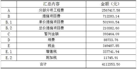 该项目的分部分项工程费合计为2567417.58元,总价措施项目费为210382.60元,单价措施项目费为501900.54元。根据2020年《四川省建设工程工程量清单定额》中规费的计取为Ⅰ档取费类别,费率为9.34%,取费基数为分部分项工程及单价措施项目定额人工费和机械费的合价,计算得出规费为88733.76元,销项增值税费率为9%,金额为337741.94元,附加税费率为0.313%,金额为11745.91元。招标人提供的暂列金额等于分部分项工程量清单合价加措施项目清单合价的12%,可得出暂列金额为393464.09元,确定工程总造价为4112353.50元。投标报价总价见表4所示。
