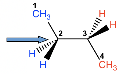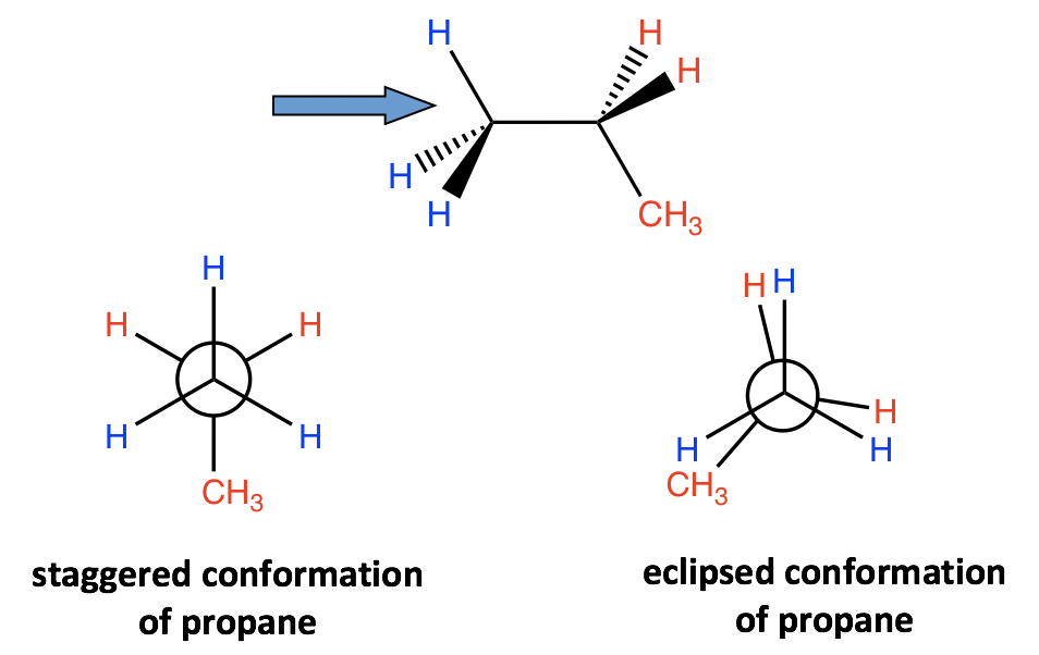注意:在重叠构象异构体中,C-H 键应该完全重叠;然而,为了使后基团仍然可见,后碳上的键故意稍微倾斜。