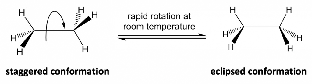 The different spatial arrangements of the atoms/groups that result from the single bond rotation are called conformations. Molecules with different conformations are called conformational isomers or conformers. The two extreme conformations of ethane coming from the C-C rotation shown above are: the staggered conformation with all of the H atoms spread out and the eclipsed conformation with all of the H atoms overlapped.