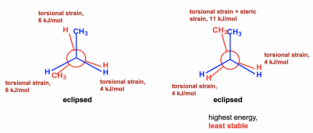 在两个重叠构象异构体 B 和 D 之间,D 比 B 更不稳定,因为两个 CH 3 基团在 D 中彼此重叠(重叠),从而导致扭转和空间应变。
