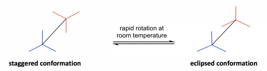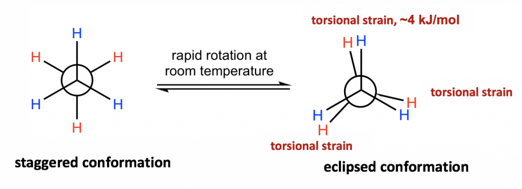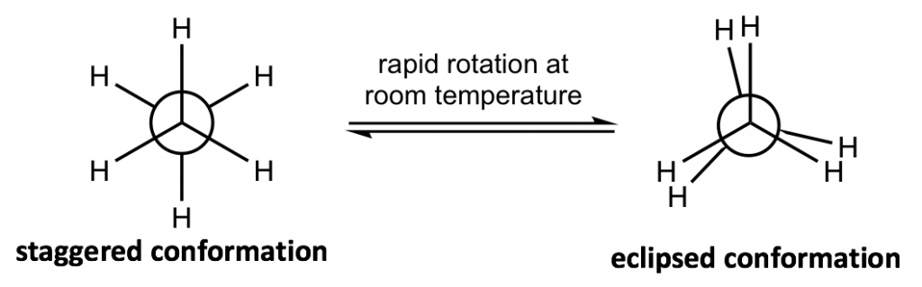 Because of this energy difference, an energy barrier must be overcome when rotation about the C-C bond occurs. However, this energy difference in ethane is small, and the kinetic energy of molecules at room temperature is high enough to cover it. So, at room temperature, the changes from staggered to eclipsed conformers occur millions of times per second. Because of these continuous interconversions, these two conformers cannot be separated from each other. However, at any given moment, about 99% of the ethane molecules will be in a staggered conformation because of their higher stability.