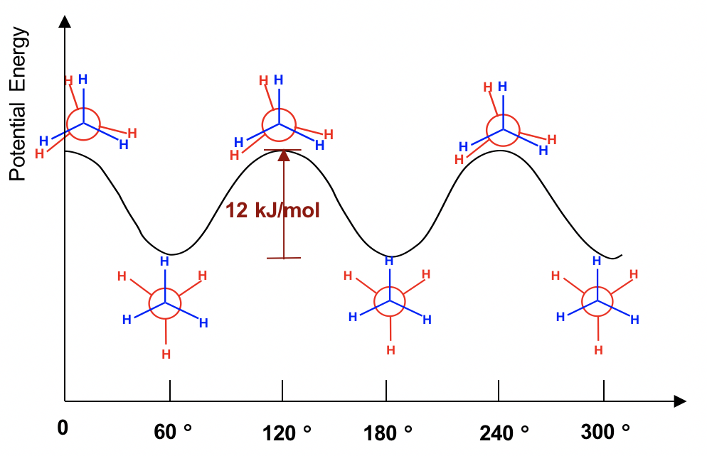 The two conformations of ethane, staggered and eclipsed, are different and therefore should be in different energy levels. You may also intuitively predict that the staggered conformation is more stable and is lower energy because the C-H bonds are arranged as far apart as possible in that conformation. That is correct! In eclipsed conformations, the H atoms on the front carbon are overlapping with the H atoms on the rear carbon, and this arrangement causes the repulsion between the electrons of C-H bonds of the two carbons. This type of repulsion is called torsional strain, also known as eclipsing strain. Due to torsional strain, the eclipsed conformer is in an energy level that is 12 kJ/mol (or about 2.9 kcal/mol) higher than the staggered one. This can be represented graphically in a potential energy diagram as shown in Figure 4.1f.