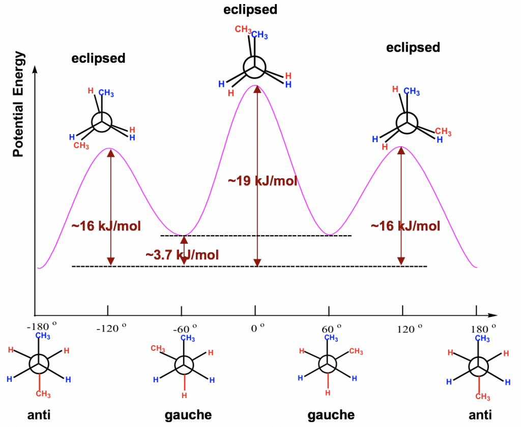 The energy difference of all the conformers obtained from the rotation about the C2-C3 bond are shown in the potential energy diagram Fig. 4.1l. The curve is more complex than that of ethane since there are four different energy levels corresponding to four conformers with different stabilities. Even the energy barriers for the rotations are larger than that of ethane, but they are still not high enough to stop rotation at room temperature.