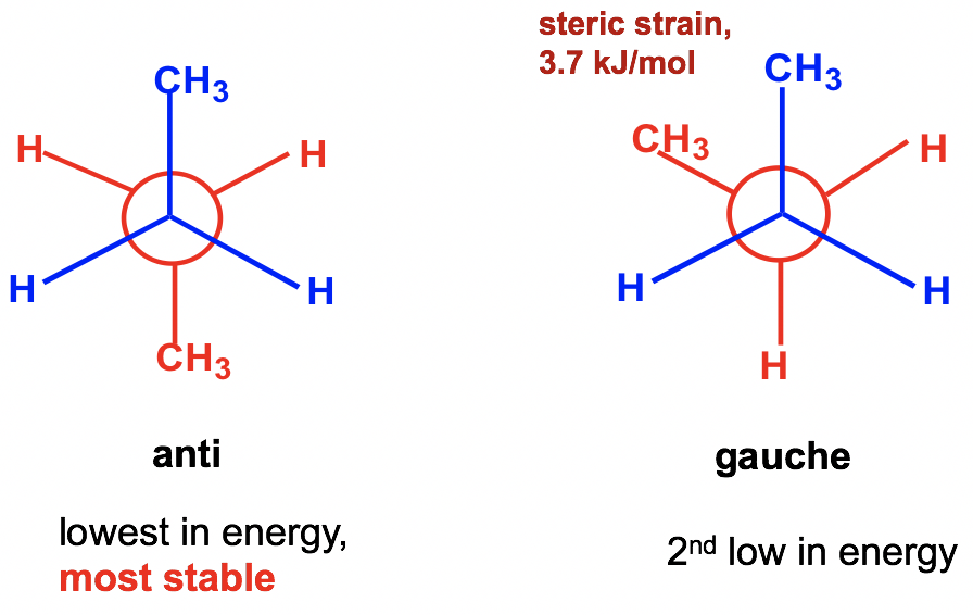 Between the two staggered conformers A and C, A is more stable than C because the two methyl CH3 groups in A are as far apart as possible. This most stable staggered conformation is called the anti–conformation (anti is Greek for “opposite”). In anti–conformations, the largest groups on the front and rear carbon are 180° opposite to each other. The other staggered conformation C is called a gauche conformation, in which the two large groups are adjacent and are 60° to each other. With the large groups being close to each other in gauche conformers, the molecule experiences steric strain. Steric strain is the strain that is caused when atoms (or groups) are close enough together that their electron clouds repel each other. Steric strain only matters when the groups are close to each other (less or equal to 60°), so steric strain does not apply in anti-conformations. The magnitude of steric strain also depends on the size of the group: the larger the size, the higher the steric strain. As a result, there is no steric strain between two small hydrogen atoms, even if they are close to each other.