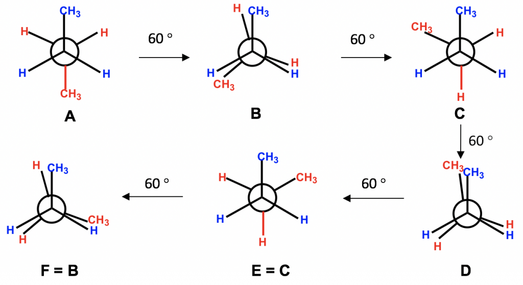 从交错构象开始,其中每个碳上最大的基团彼此相对(远)(这称为“反”构象,我们稍后将了解到);Keep the groups on one carbon “fixed”, and rotate the groups on the other carbon at 60° angles. Repeat the rotation five times, and you should get total of six conformers.