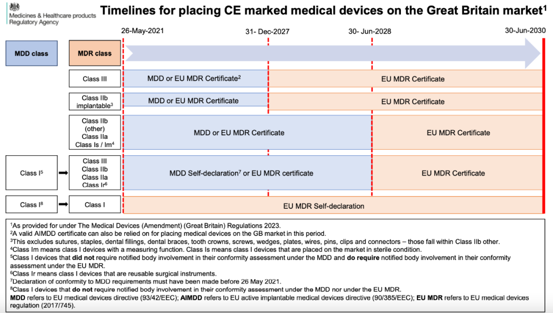 另外,特别注意的是,自欧盟2023.03.01颁布MDR过渡期延期法案后,英国监管机构MHRA于2023年7月更新的针对依赖过期或即将到期的CE证书产品的注册指南《Guidance on registration of certain medical devices which are reusable Class I devices, upclassified Class I devices, and/or reliant on expired/expiring CE certificates》,对此前依赖CE证书已进行MHRA注册,和目前用即将到期/已到期的CE证书进行MHRA注册的产品进行指导。同时英国发布了对持CE证书产品在英国的认可时间线(如下):