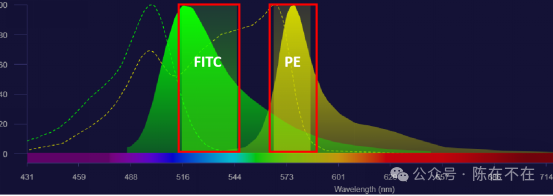 荧光通道的信号是特定激发下的某一波长范围内的光信号,并不等于特定荧光素的光信号,只有在理想情况下,荧光通道的信号就是对应荧光素的光信号。以市面上最常用的报告荧光SAPE为例,在下图中可以看到FITC荧光素的发射光有部分进入到了PE检测通道中,那么PE通道的信号值(流式的试剂检测值)其实等于PE荧光素的光信号还要加上FITC荧光素溢漏到PE通道中的光信号,如果我们想要知道的是PE荧光素的光信号,那这个时候就要扣除掉FITC荧光素溢漏到过PE通道的光信号。