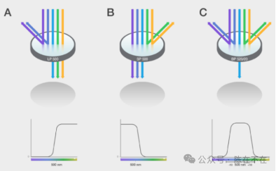 • 带通滤光片(BP):只有特定波长范围内的光可以通过滤光片,如BP572/30滤光片允许557nm-587nm(572±15)波长的光通过
