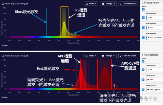上图为典型的流式荧光模式:APCAPC-Cy7双荧光编码+PE报告荧光在蓝、红激光对应三荧光检测通道下的检测示意图。在考虑其他的方案时可使用赛默飞的荧光光谱查看器(SpectraViewer)之类的工具进行初步分析。