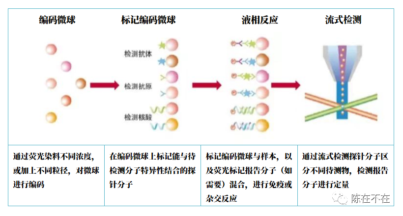 包括所有利用微球——不管是否有磁性,去捕捉溶液中的待测分子,利用流式原理进行检测——微球流动起来,目前看一定是荧光的技术。