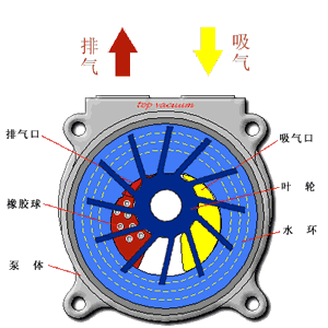 叶轮与泵壳成偏心,泵壳内充一定量的水,叶轮旋转使水形成水环。相邻叶片(如图中红色叶片)旋转时,与水环形成的空间(气室)变大即进气,空气(气室)逐渐变小,即空气被压缩。多组相邻叶片,即多组往复压缩。结构紧凑、工作平衡可靠和流量均匀,所以化工生产中多用来输送或抽吸易燃、易爆和有腐蚀性的气体。水环式真空泵由于叶轮搅拌液体,损失能量大,故其效率很低。