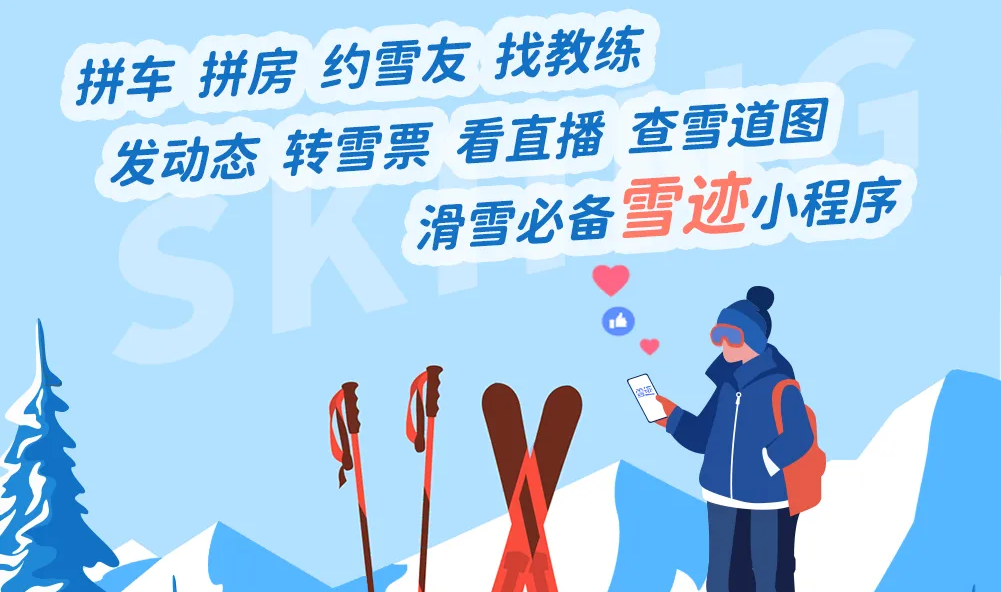 雪迹滑雪小程序,主要功能:拼车、拼房、转雪票、约雪友、找教练、看雪场直播以及查雪道图