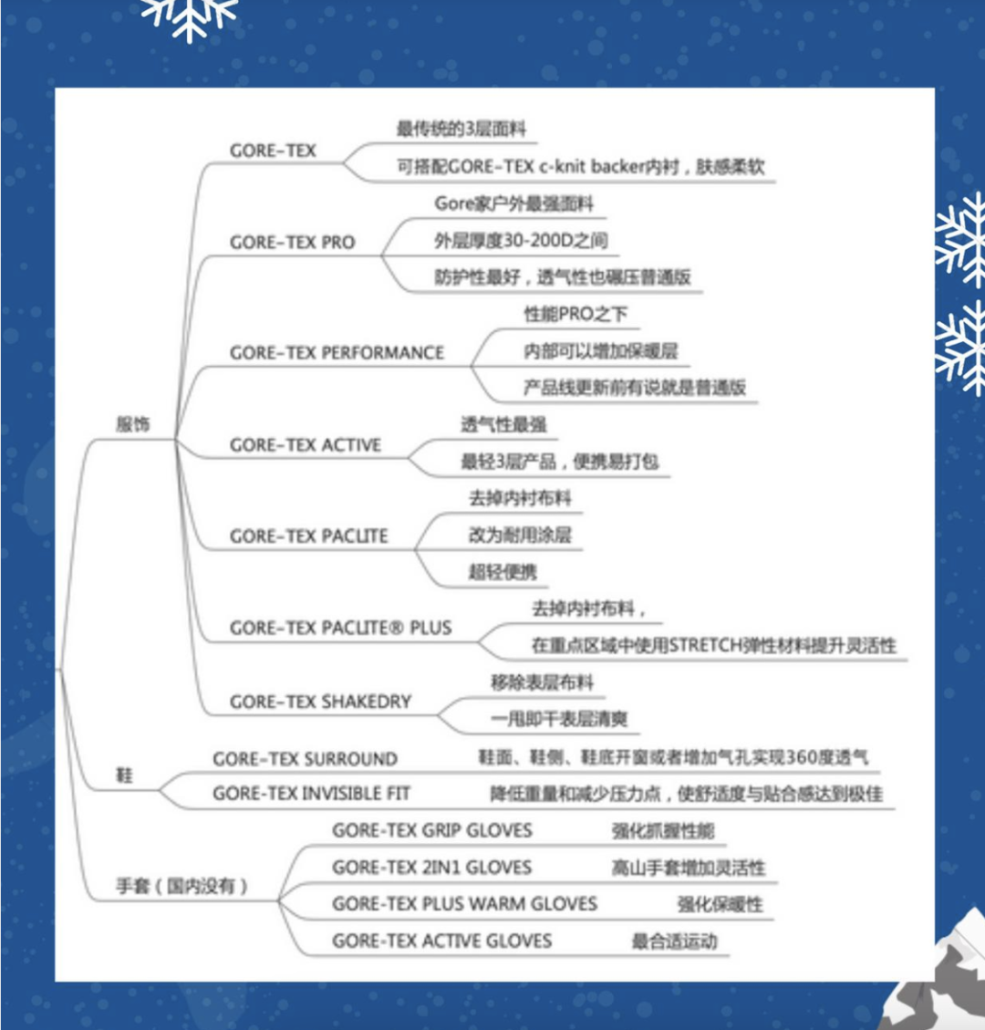 1. 服装类:这包括了雪服、雪裤、中间层、速干衣、护脸、雪袜和手套。这些服装的选择关键在于保暖、防水和透气性能,确保在滑雪过程中既舒适又安全(科普一下三层穿衣法:外层防风透气防水、保暖层保暖透气、贴身层吸汗排湿透气)。