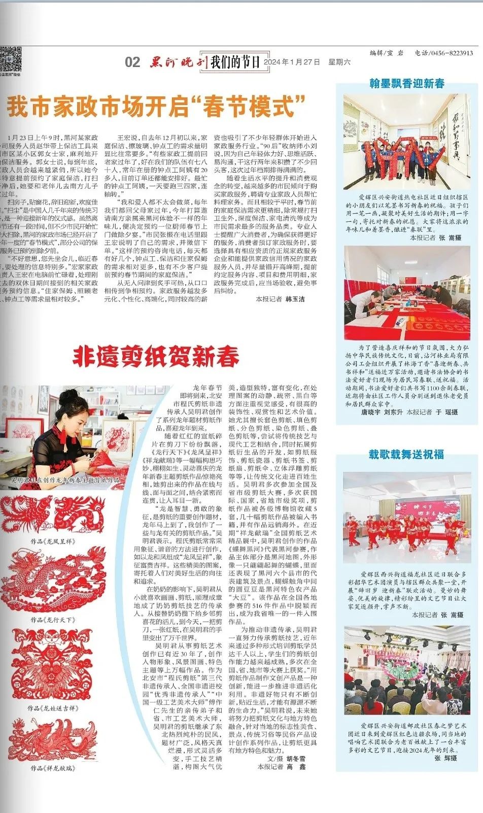 龙年春节即将到来,北安市程氏剪纸非遗传承人吴明君创作了系列龙年题材剪纸作品,喜迎龙年到来。