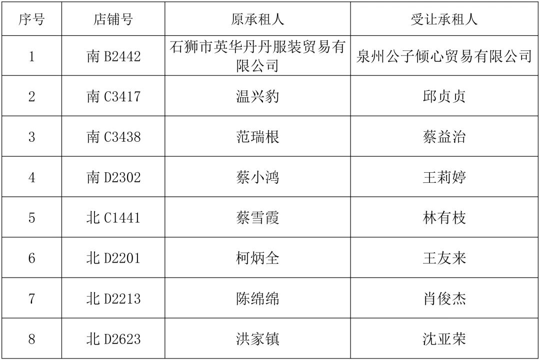 因部分承租人在合同期内将店铺租赁权转让给他人,根据原承租人与受让承租人申请并提供的相关材料,经福建省石狮服装轻纺名城运营有限公司审核后,现将申请变更承租人名单公示如下:
