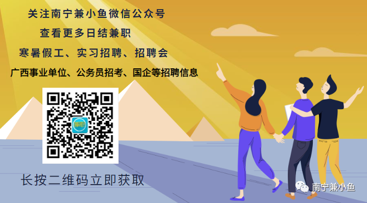兼小鱼广西第一临时工平台!兼小鱼工作都是首发,市面上同类型公众号工作均为抄袭本平台。为了您第一时间能查看到最新工作,请关注加收藏!
