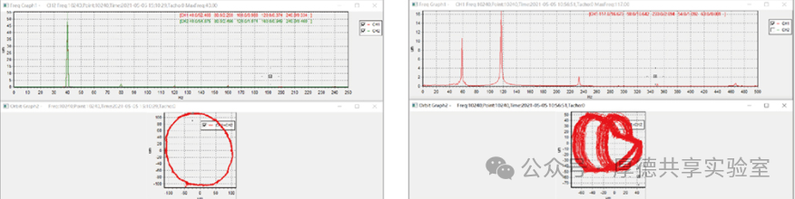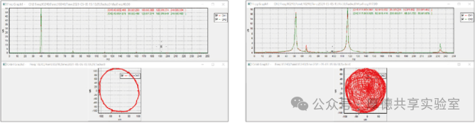 打开轴心轨迹图,逐渐提高转速,同时要注意观察转子转动速度和振幅的变化,接近临界转速时,可以发现振幅迅速增大,转子运行噪声也加大,转子通过临界转速后,振幅又迅速变小,由此可大致确定转子系统基频所在区间,我司滑动轴承实验台临界转速大概在3500rpm左右。继续升高转速,观察轨迹变化,当转速大约升至临界转速的两倍左右时,转子的振动剧烈增加,轴心轨迹也从原来的“椭圆形”变为双椭圆形,如下图所示,此时的现象表明转子系统发生油膜涡动,记录发生涡动的转速。