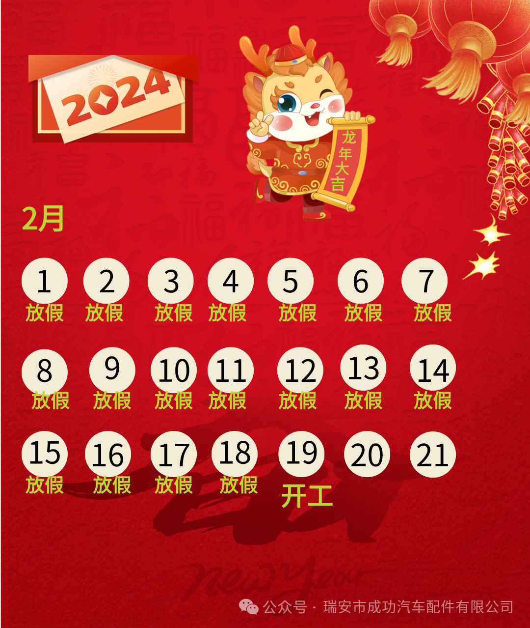 瑞安成功汽车配件有限公司 预祝各位龙年大吉,愿我们携手共进,如龙腾四海般勇往直前。在新的一年里,愿事业蓬勃发展,创新不断,成就辉煌,员工幸福安康 。