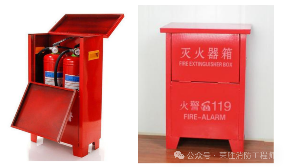 2.手提式灭火器设置在灭火器箱内。开门型灭火器箱的箱门开启角度不应小于175°,翻盖型灭火器箱的翻盖开启角度不应小于100°。